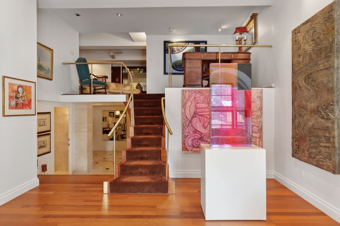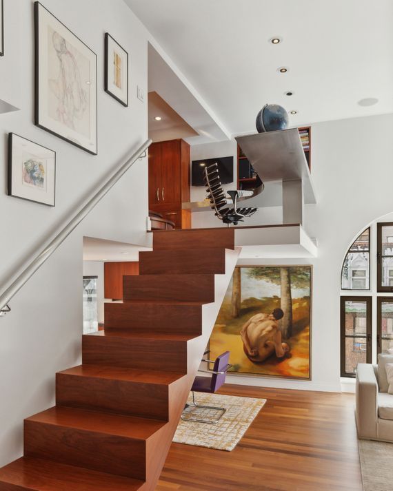 “The apartment can feel like a gallery, perfect for a cocktail party,” Schier said. He pulled up the wall-to-wall carpet and put down floors of Brazilian walnut. Carpeting by Stark up the steps matches the tone of the wood.