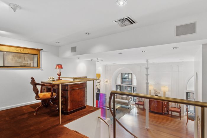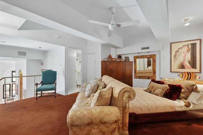 The stylish scion of a garment-industry family, Schier fell in love at first sight with the lobby, a double-height great room with a romantic balcony that rings the second level and a coffered Moorish ceiling. On the fifth floor, he gawked at apartments carved into the building’s former ballroom with arched windows looking out over the street. 5F was a one-bedroom duplex with stairs leading up from a foyer to the former ballroom, then tracking further up to a lofted bedroom. He paid $298,000 — less than $1 million today — and never left, later buying the neighboring one-bedroom duplex, 5G, and combined the two to create an oversize two-bedroom with a wild amount of custom design work — including a curved metal desk built into a home office and flat-screens mounted into the tile across from a tub. “That way I can watch Diana Ross videos,” he said. “I did everything to the nth degree.”