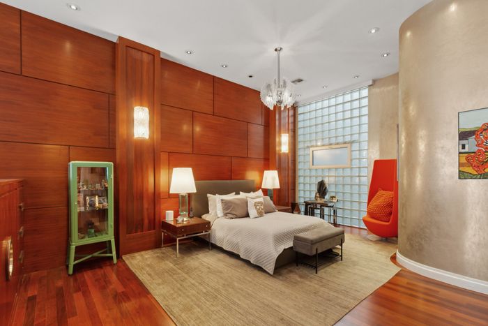 Glass tile in the former 5G apartment’s primary bedroom gets light from an air shaft. The silver wallpaper adds drama and carves out space for a storage unit accessed from outside. Schier extended the Brazilian walnut from the floor to create a feature wall.