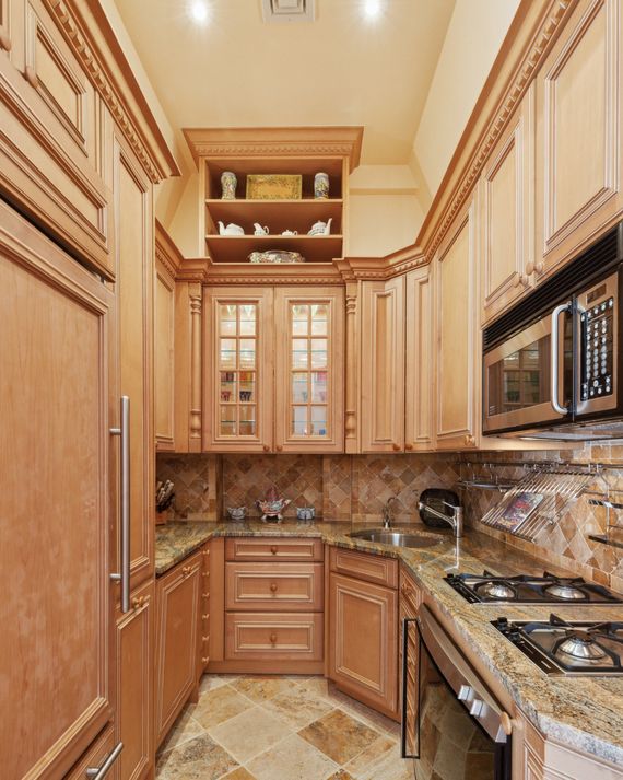 The original kitchen of 5F was around the same size as in this photo but was finished cheaply by the developer with Formica countertops. Schier discovered the ceiling had been dropped, and a renovation added custom cabinetry to the full height of the room. “Whatever I did, I didn’t skimp,” he said.