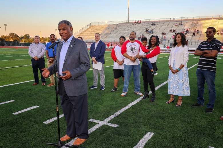Former Arlington ISD trustee Michael Glaspie speaks during the dedication ceremony at the new Michael Glaspie Field Athletic Complex on Oct. 9. (Courtesy photo | Arlington ISD)