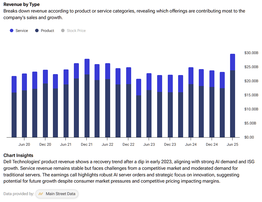 Furthermore, DELL’s Infrastructure Solutions Group (ISG) marked its sixth consecutive quarter of double-digit growth earlier this year, with total revenue rising 44% and hitting a record $16.8 billion. Meanwhile, when it comes to servers and networking specifically, DELL delivered a ~70% boost, hauling in almost $13 billion last quarter. Product still dominates DELL’s revenue mix over Service.