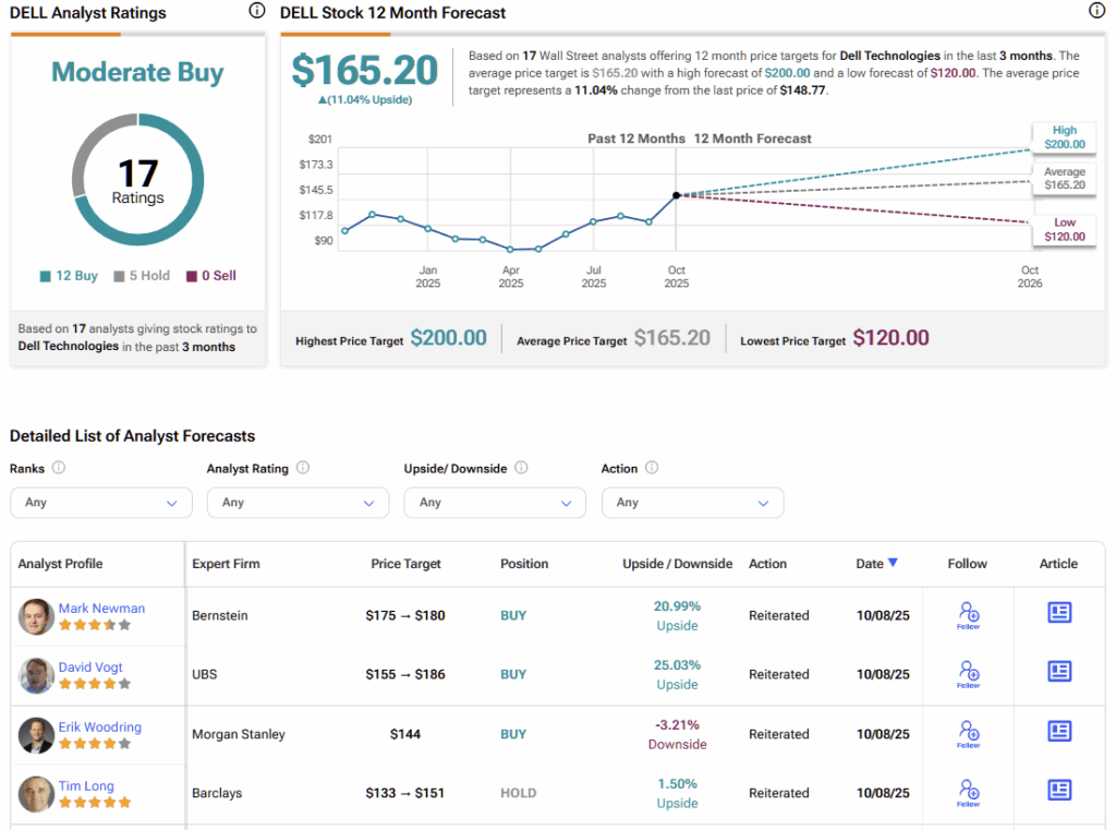 Overall, according to 17 Wall Street analysts, Dell carries an average stock price target of $165.20, representing an upside potential of ~8% over the next 12 months.