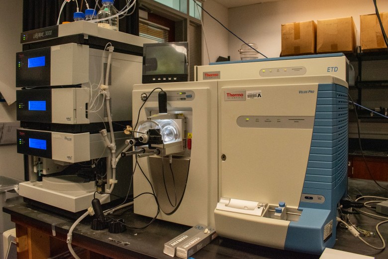 A mass spectrometer, one of the tools Chowdhury and his graduate students use to conduct their research, sits in the lab on Oct. 13, 2025, at the University of Texas at Arlington. (McKinnon Rice | Fort Worth Report)