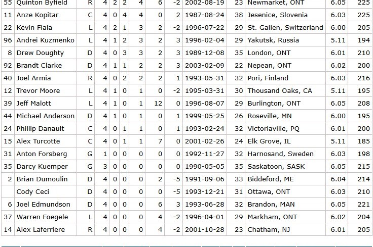 —There is less optimism around Kuemper, who it’s looking like won’t be available to play today with an injury. That puts Forsberg in-line to start tonight, the Kings just re-acquired Copley from Tampa via a trade yesterday (who LA recently lost to the waiver wire to TB) as Copley continues to bounce around to a team in need of a backup goalie.