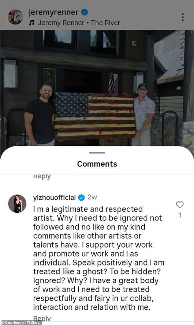 Zhou said some of the stories that sparked her posts included reports of court claims by Renner’s ex-wife Sonni Pacheco, alleging that the Hurt Locker star took drugs and threw debauched parties, failing to take care of their young daughter Ava.