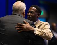 Pastor Solomon Adair embraces Arlington Mayor Jim Ross during the 20th annual State of the City Address on Oct. 16 at Esports Stadium Arlington. The event featured performances by the Arlington Police Department Honor Guard and American Idol season 22 contestant Odell Bunton Jr.