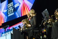 People dressed in black play brass instruments, in front of a screen that reads "State of the City Address."