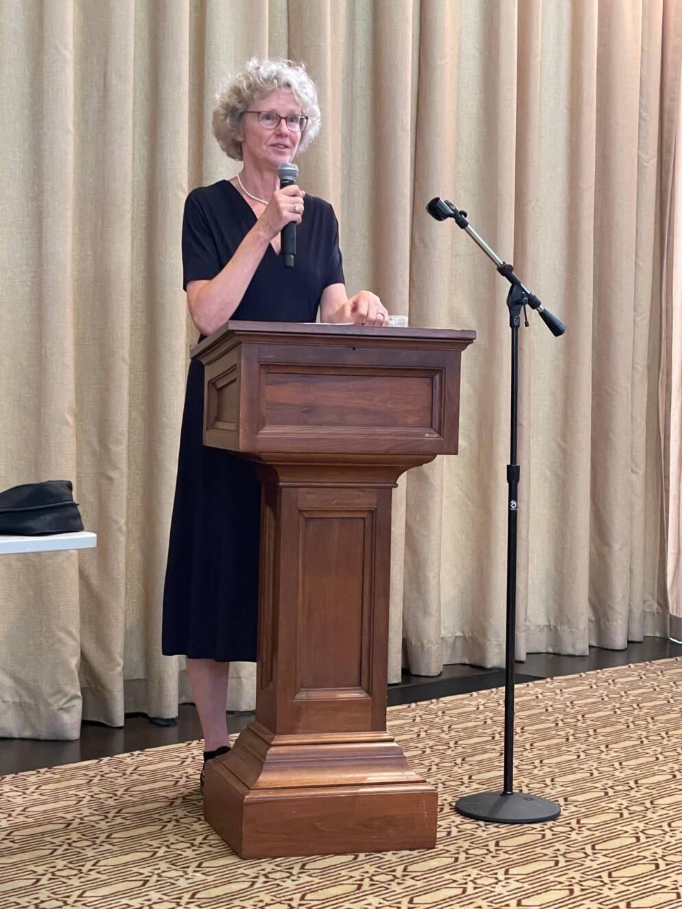 Liesbeth Heenk, founder and editor-in-chief of Amsterdam Publishers, which specializes in Holocaust memoirs, speaks at Congregation Rodeph Shalom in Philadelphia. (Photo by Darcy Grabenstein)