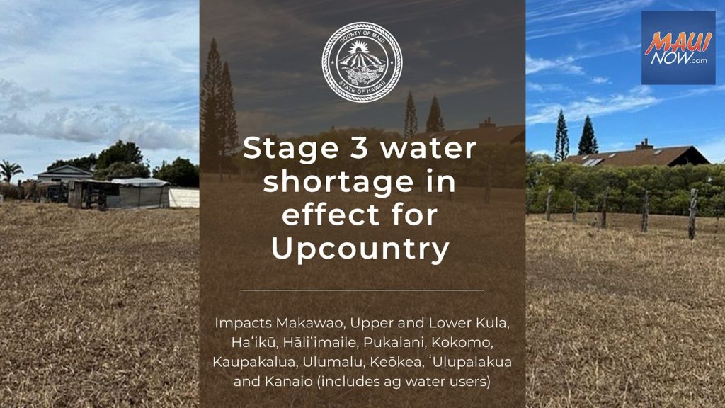The Maui Department of Water Supply on Friday announced a Stage 3 water shortage for consumers in the Upcountry Maui service area, requiring the implementation of mandatory and strict water conservation measures.
