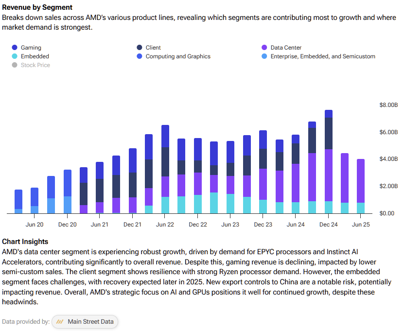 AMD’s upsized AI ambitions are built on a solid, if recently challenged, financial foundation. The company recently changed its segment reporting by merging two previously separate segments, Client and Gaming. Its second-quarter 2025 results were a mixed bag. The Data Center segment was hit by an $800 million inventory charge related to U.S. export controls on shipments to China, which dragged down gross margins significantly – from 49% to 39.8%.
