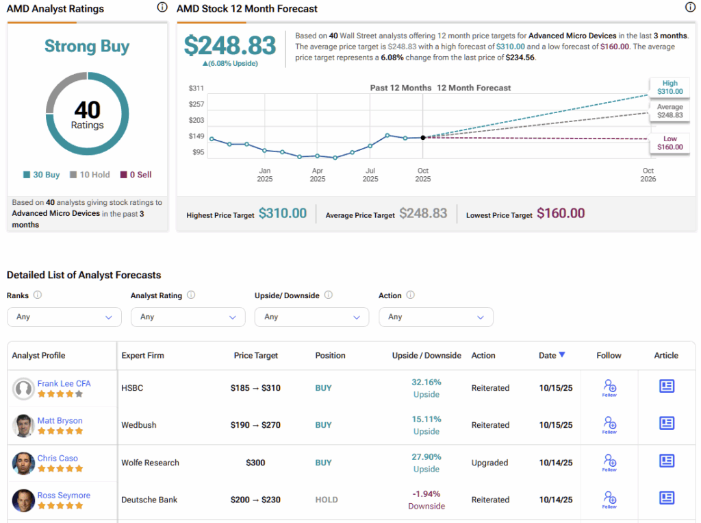 Wall Street analysts are bullish on Advanced Micro Devices. AMD stock carries a consensus Strong Buy rating based on 30 Buys and 10 Hold ratings by leading analysts during the past three months. Currently, AMD stock has an average stock price target of $248.83, implying more than 6% potential upside over the next twelve months.