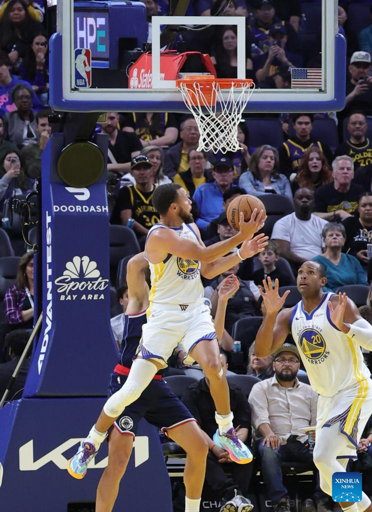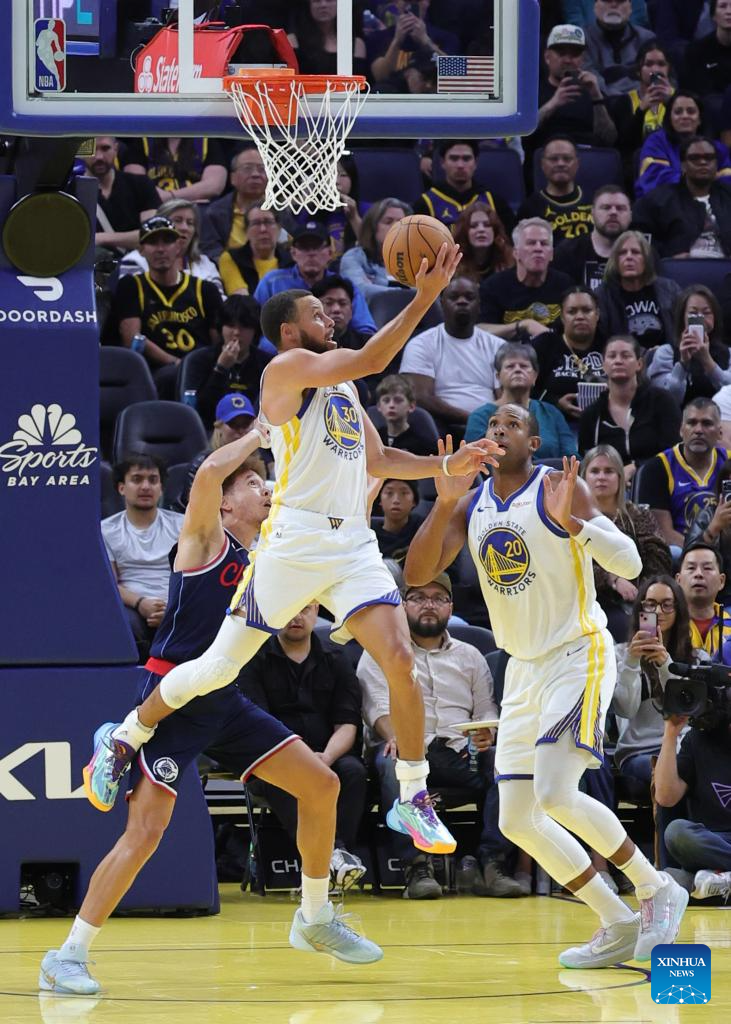 Stephen Curry (C) of Golden State Warriors goes for a layup during the 2025-2026 NBA preseason game between Golden State Warriors and Los Angeles Clippers in San Francisco, the United States, on Oct. 17, 2025. (Photo by Arthur Dong/Xinhua)