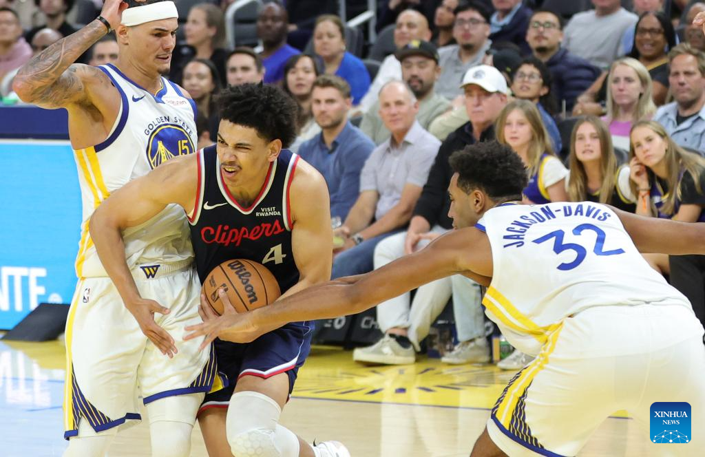 Kobe Sanders (C) of Los Angeles Clippers competes during the 2025-2026 NBA preseason game between Golden State Warriors and Los Angeles Clippers in San Francisco, the United States, on Oct. 17, 2025. (Photo by Arthur Dong/Xinhua)
