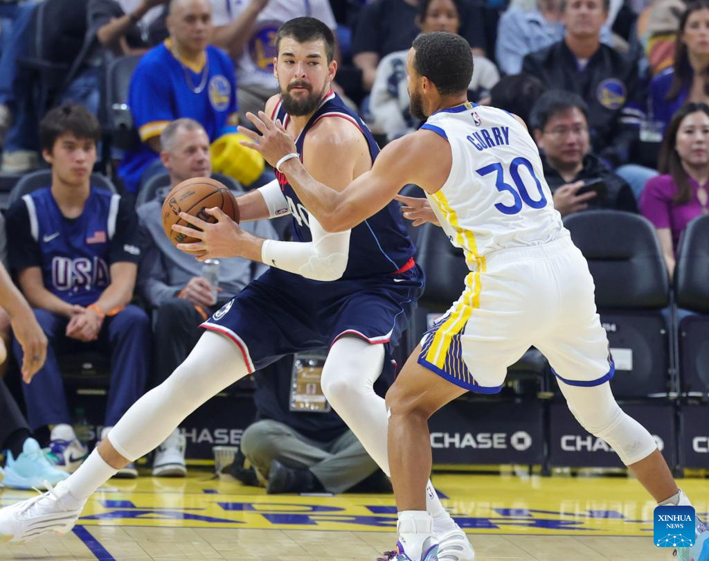 Stephen Curry (R) of Golden State Warriors defends Ivica Zubac of Los Angeles Clippers during the 2025-2026 NBA preseason game between Golden State Warriors and Los Angeles Clippers in San Francisco, the United States, on Oct. 17, 2025. (Photo by Arthur Dong/Xinhua)