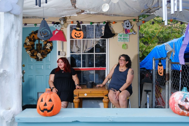 Amber DeLeon (left) sits with her mother Angela Gomez (right) at the East Side home of Amber’s grandmother on Thursday, Oct. 16, 2025. Every night extended family gathers on their porch to hang out and check in with each other. Credit: Clint Datchuk for the San Antonio Report