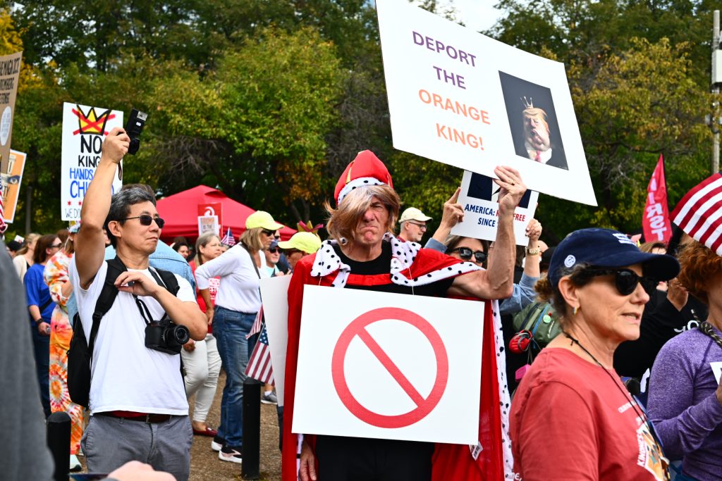 Demonstrators came prepared with creative, homemade costumes and signs that mocked President Trump and others in his administration, including Homeland Security Secretary Kristi Noem, who accompanied masked federal agents on raids in Chicago earlier this month.