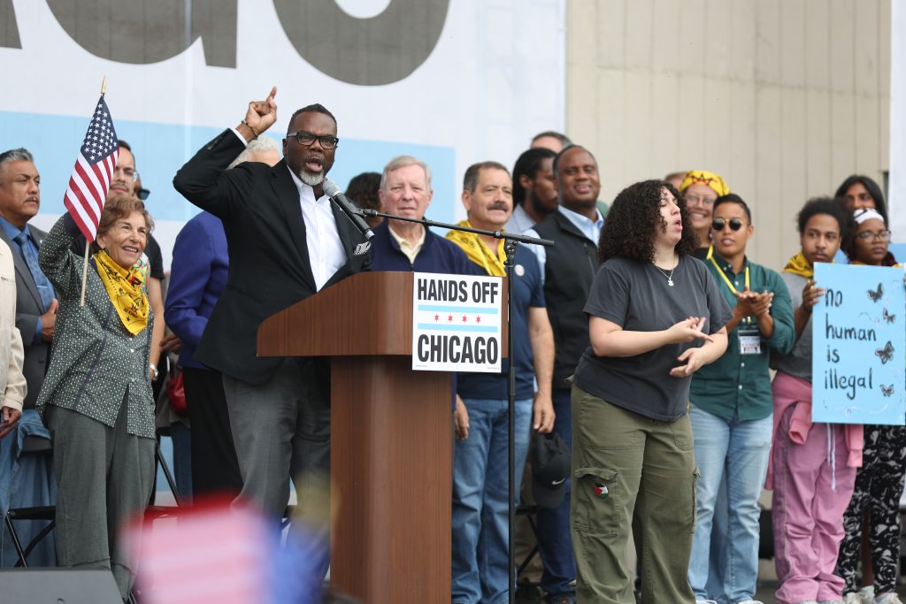 Mayor Brandon Johnson speaks at the No Kings protest at Butler Field in Downtown Chicago on Oct. 18, 2025. Credit: Talia Sprague for Block Club Chicago