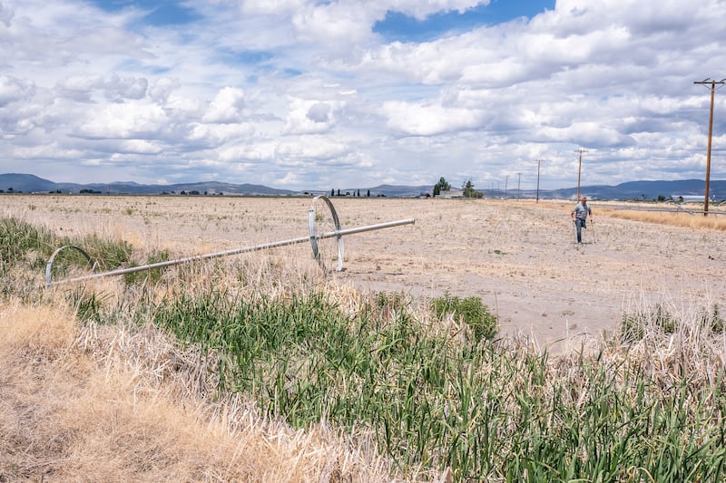 In this June 9, 2021, file photo, farmer Ben DuVal walks past a dry irrigation pipe in a field he had rented for crops this year but was unable to plant due to the water shortage in Tulelake, Calif. DuVal’s family has farmed the land near the California-Oregon border for three generations, and this summer for the first time ever, he and hundreds of others who rely on irrigation from a depleted, federally managed lake aren’t getting any water from it at all. | Nathan Howard, Associated Press