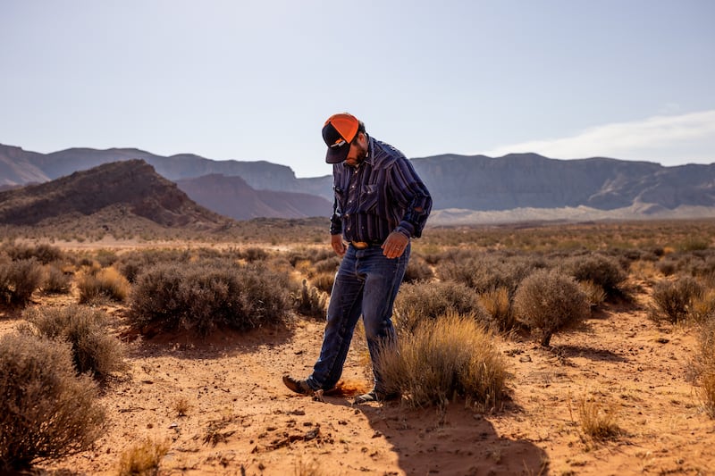 Kelby Iverson checks the moisture in the soil and the state of natural forage on Bureau of Land Management land on which his cattle typically winter in Hurricane, Washington County, on Friday, Sept. 9, 2022. Due to the persistent drought in the area, Iverson said he has never seen the land so bare of edible forage. | Spenser Heaps, Deseret News