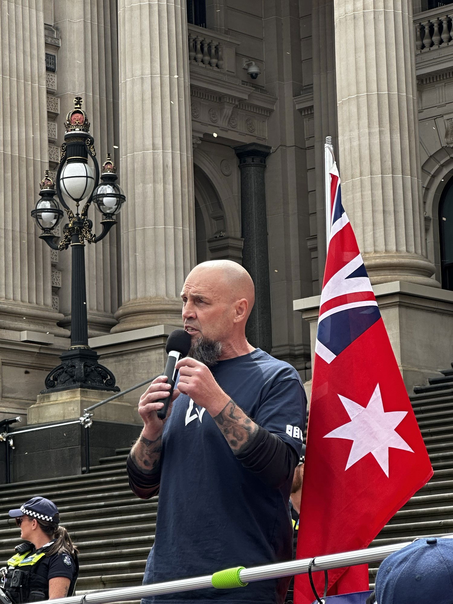 Sean Plesa was one of the protesters who turned up early at Melbourne’s March for Australia rally, carrying an Australian flag and an Eureka Stockade flag.