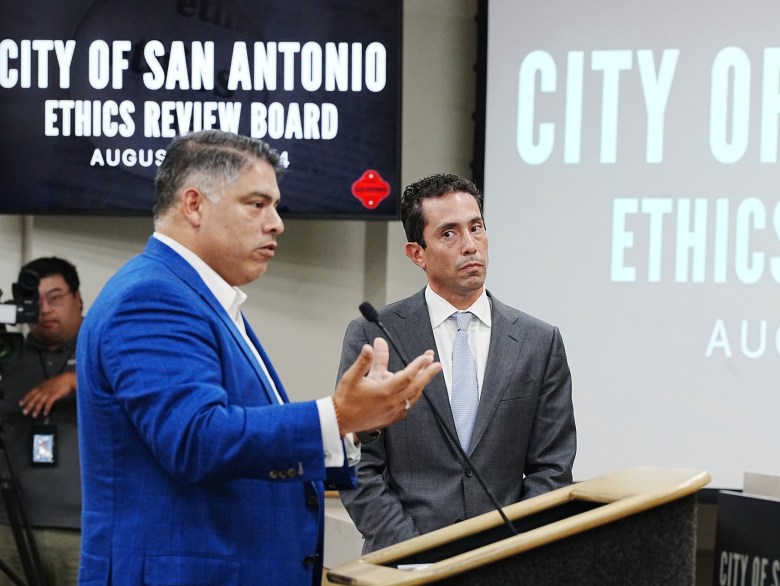 Councilman Marc Whyte (D10) listens to his witness Councilman Manny Pelaez (D8) at the Ethics Review Board hearing to further investigate a 2024 complaint made against him by San Antonio attorney Martin Phipps. Credit: Brenda Bazán / San Antonio Report