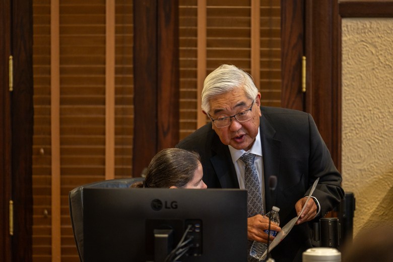 Bexar County Judge Peter Sakai discusses a document with a court official during a county budget work session Tuesday, Aug. 26, 2025. Credit: Diego Medel / San Antonio Report