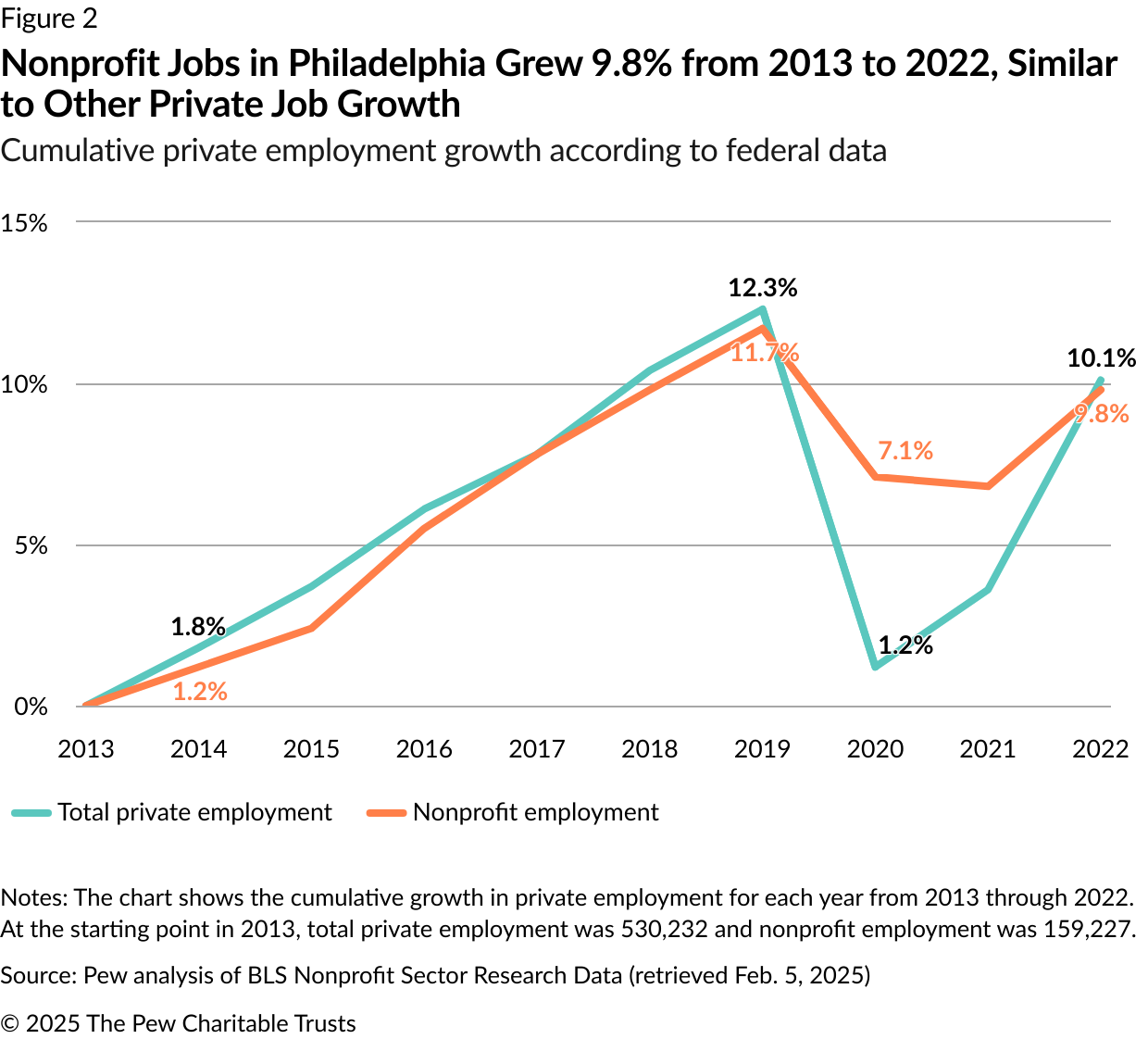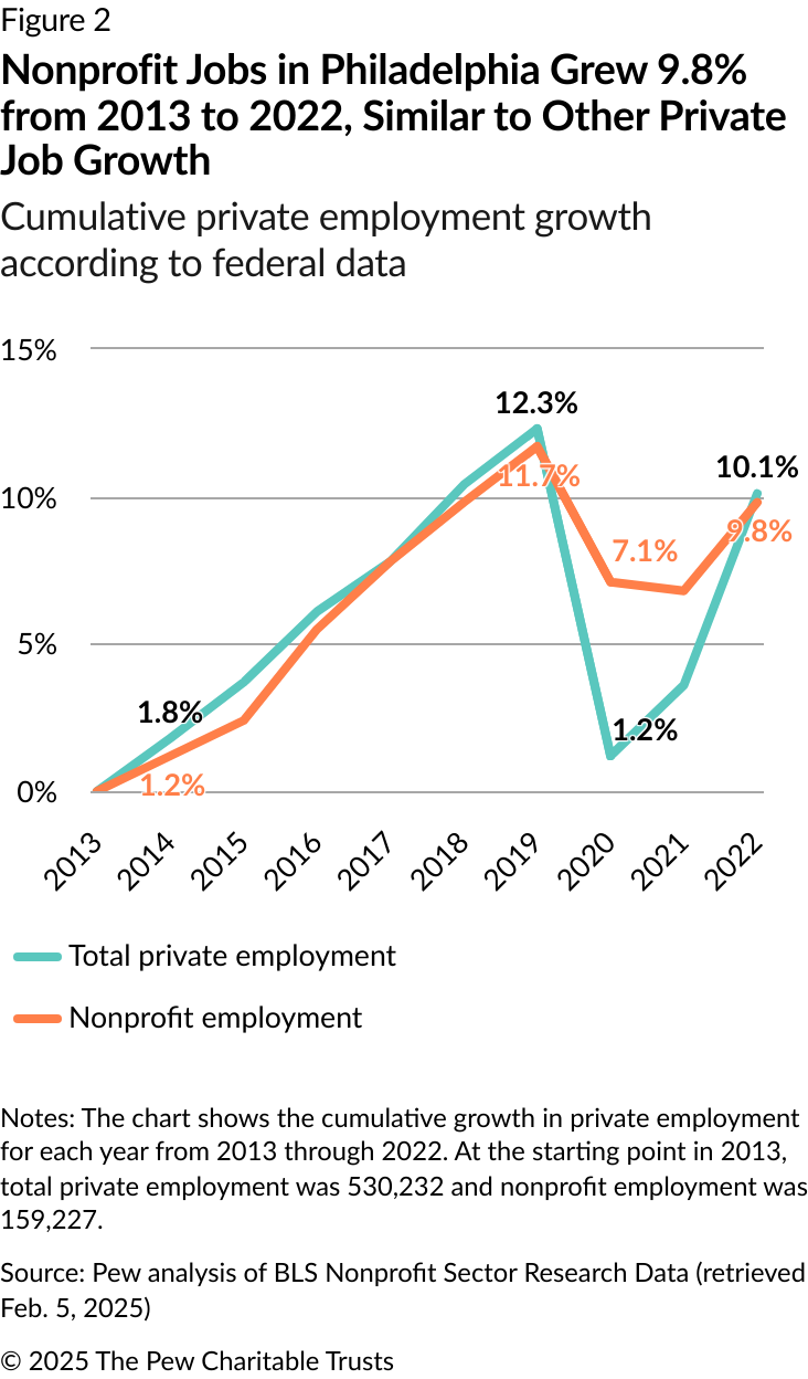 From 2013 through 2022, nonprofit job growth in Philadelphia generally matched total private industry employment growth, with each rising about 10%. But there were variations. For instance, during the pandemic, nonprofit employment in the city fell much less than overall private employment did, perhaps because of the large share of essential workers within these organizations, such as hospitals and other health care settings, during that time. (See Figure 2.)
