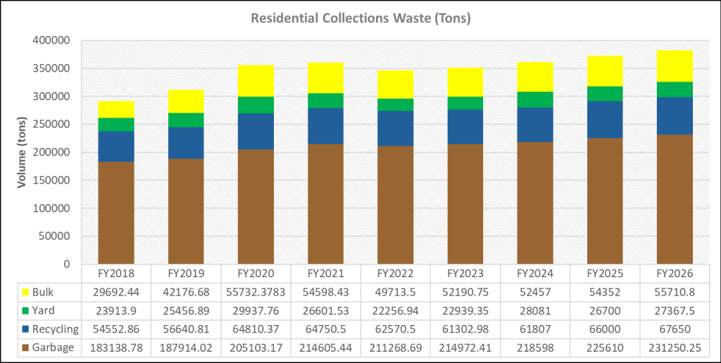The graph shows the amount of different types of residential waste collected in Fort Worth’s service area between 2018 and 2025. The graph includes Fort Worth’s waste projections for 2026. (Courtesy image | City of Fort Worth)
