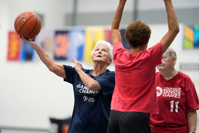 Gail Eppley, 86, from Charlotte, North Carolina, plays basketball Monday, July 28, 2025, in Ankeny, Iowa, at the National Senior Games, presented by Humana. After making her varsity team as a sixth grader, basketball has remained central to Eppley’s life. Even after two knee replacements, two hip replacements and ankle surgery, she continues to compete. | Matthew Putney, Associated Press for Humana Inc.