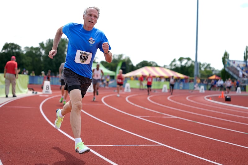 Jim Hutchinson, 78, from Louisville, Kentucky, competes in the 400-meter dash on Wednesday, July 30, 2025, at the National Senior Games, presented by Humana, in Ames, Iowa. Hutchinson has been a runner since age 12 and has competed in three previous games, this year competing in the 200-meter and 400-meter sprints. | Matthew Putney, Associated Press for Humana Inc.