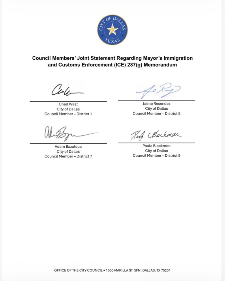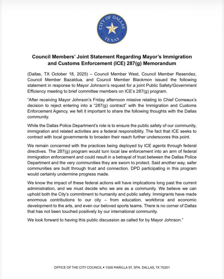Just minutes ago, Council Members Adam Bazaldua (District 7), Chad West, Jaime Resendez, and Paula Blackmon issued a joint statement publicly rebuking Mayor Johnson’s push for ICE collaboration. “We remain concerned with the practices being deployed by ICE agents through federal directives,” the statement reads.