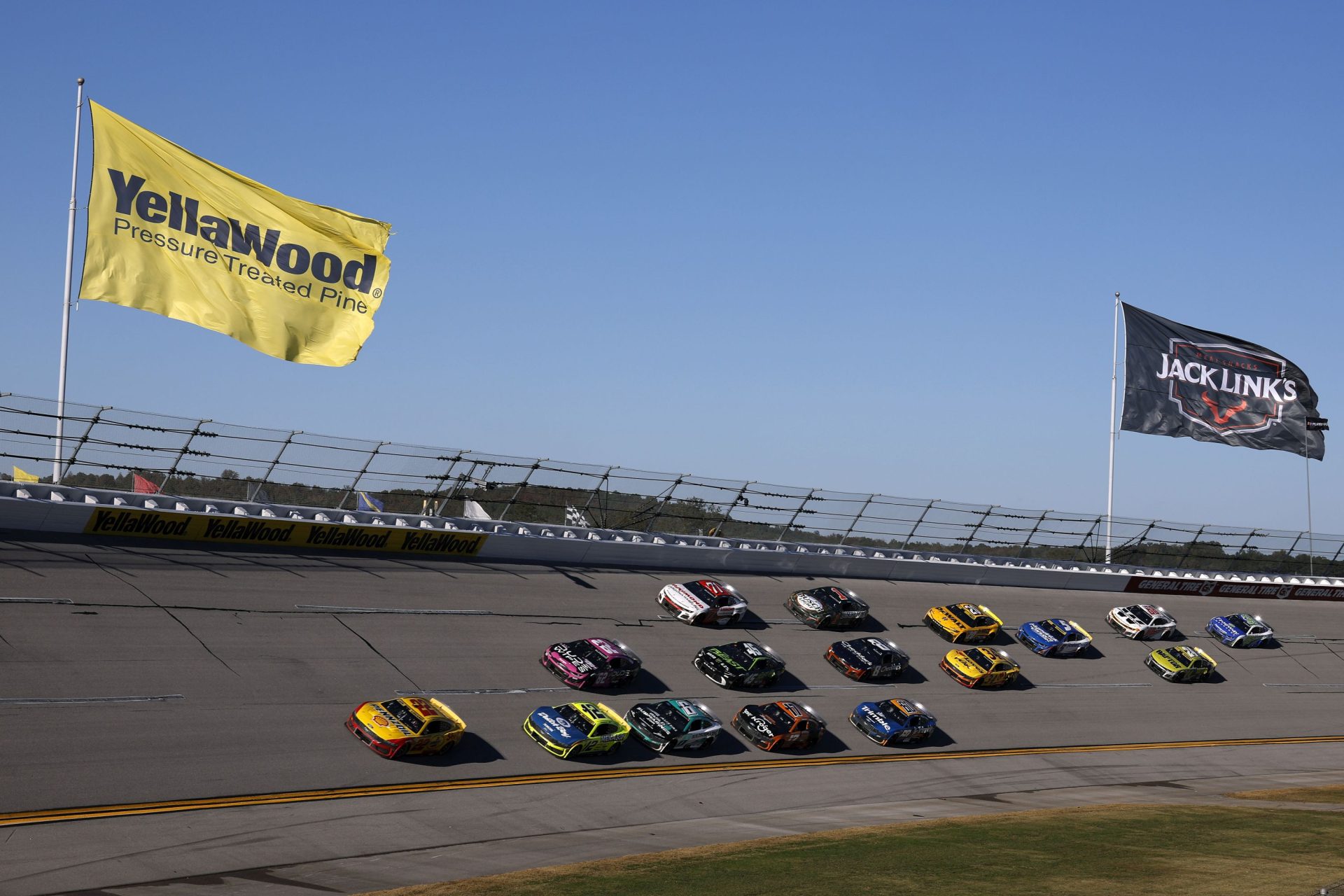 Joey Logano, driver of the No. 22 Shell Pennzoil Ford, leads the field during the NASCAR Cup Series YellaWood 500 at Talladega Superspeedway on October 19, 2025, in Talladega, Alabama. (Photo Credit: Sean Gardner | Getty Images)