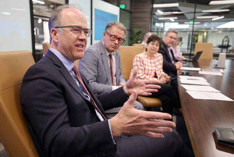 Dr. Bob Carter, University of Utah Health CEO and executive vice president for health sciences, talks with the Deseret News editorial board at the Deseret News office in Salt Lake City on Wednesday, April 23, 2025. Taylor Randall, University of Utah president, and Mitzi M. Montoya, University of Utah provost and executive vice president for academic affairs, are next to him. | Kristin Murphy, Deseret News