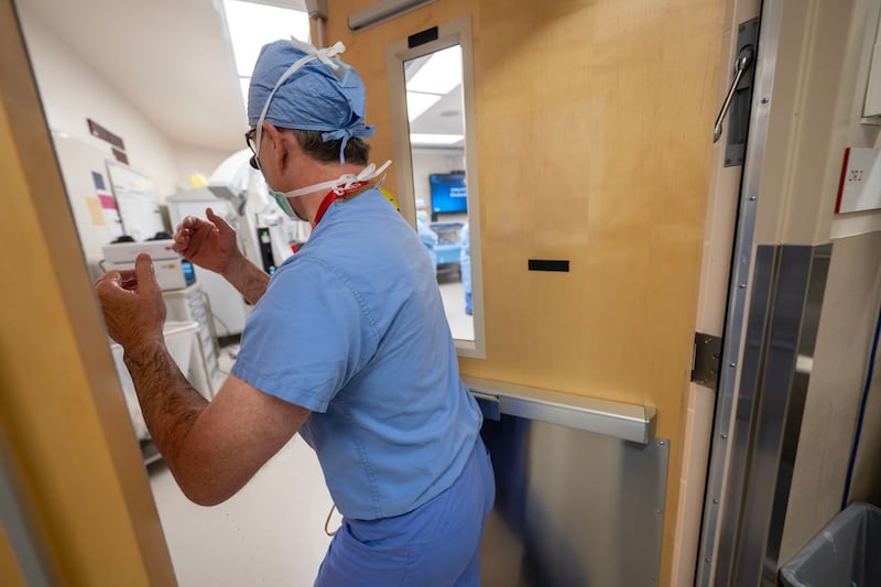 Dr. Bob Carter, chief executive officer of University of Utah Health and executive vice president of University of Utah for health sciences, enters the operating room after scrubbing prior to surgery to remove a tumor from a patient in Salt Lake City on Friday, Oct. 10, 2025. | Scott G Winterton, Deseret News
