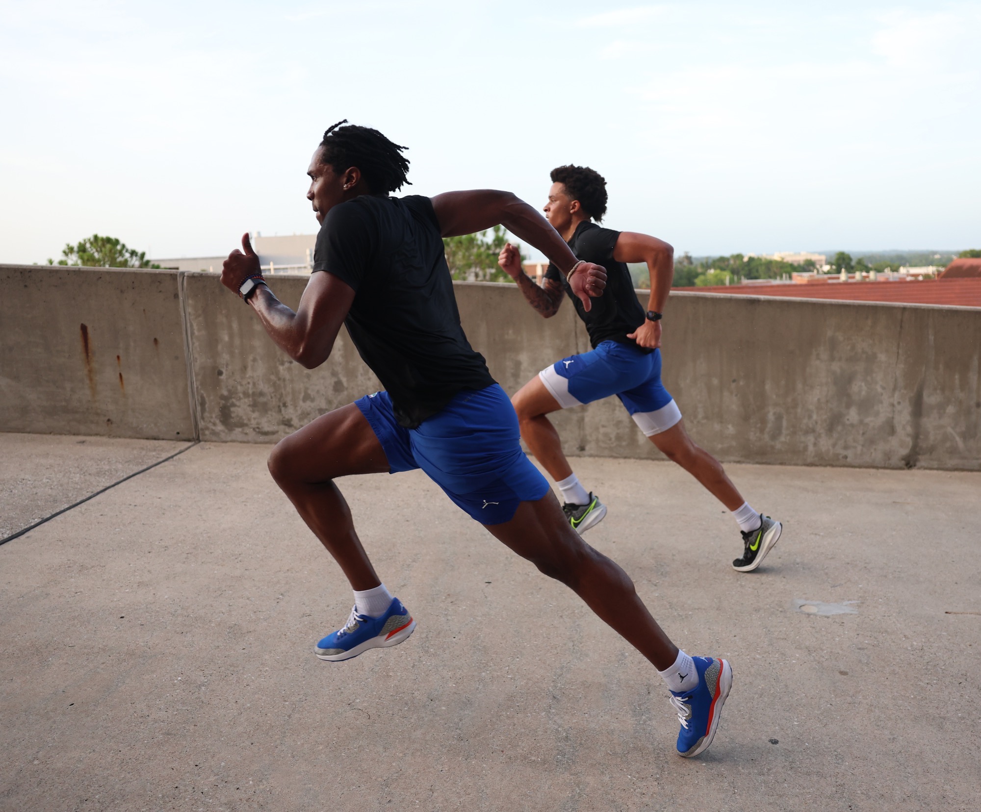 AJ (foreground) and Isaiah (background) during a summer morning conditioning session at Ben Hill Griffin Stadium.