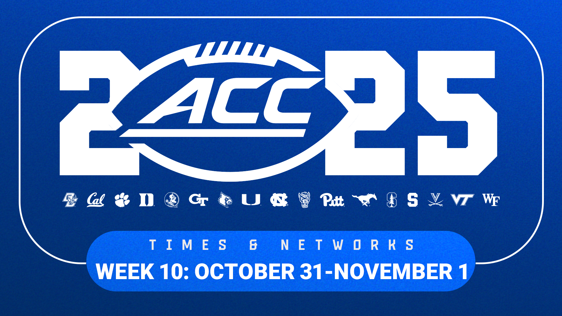CHARLOTTE, N.C. (theACC.com) – The Atlantic Coast Conference and its television partners have announced the following football game times and networks for Week 10 of the season, October 31-November 1.