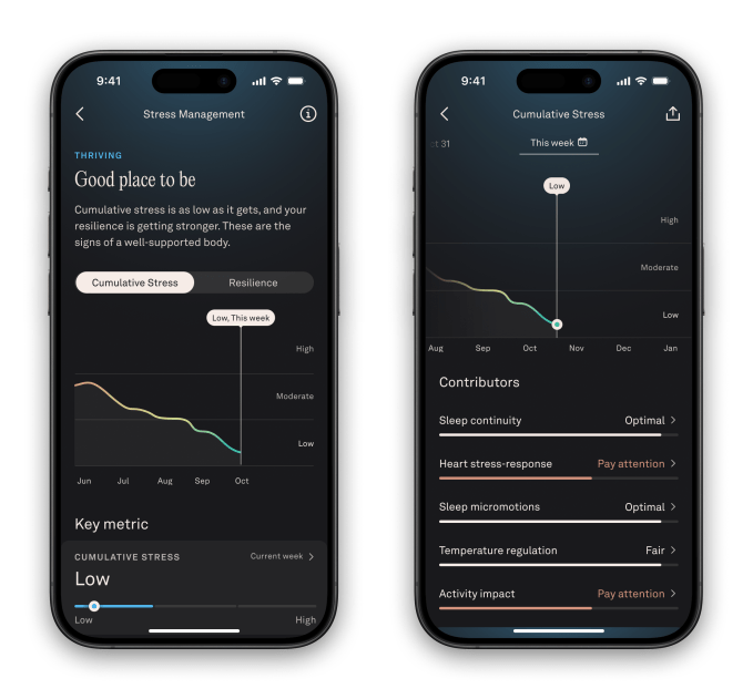 “It’s much more than just tallying the hours spent in stressful periods,” Oura VP of Consumer Software Product, Jason Russell, told TechCrunch. “It’s actually measuring different bodily functions indicative of cumulative stress taking a toll on your body. So things like how your heart rate and heart rate variability respond after a period of stress is indicative of cumulative stress. Your thermodynamics. How you regulate temperature overnight, how continuous your sleep is. Whether you experience what we call sleep, micro-motions, so not just big movements during sleep, but twitches. There are little signatures that would be indicative of your body experiencing high cumulative stress.”
