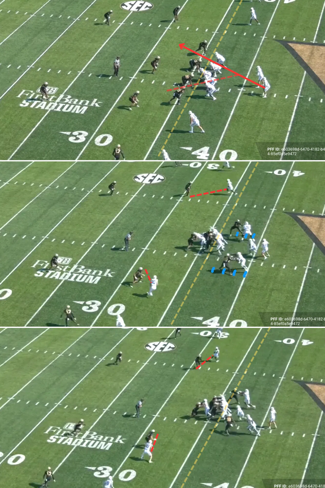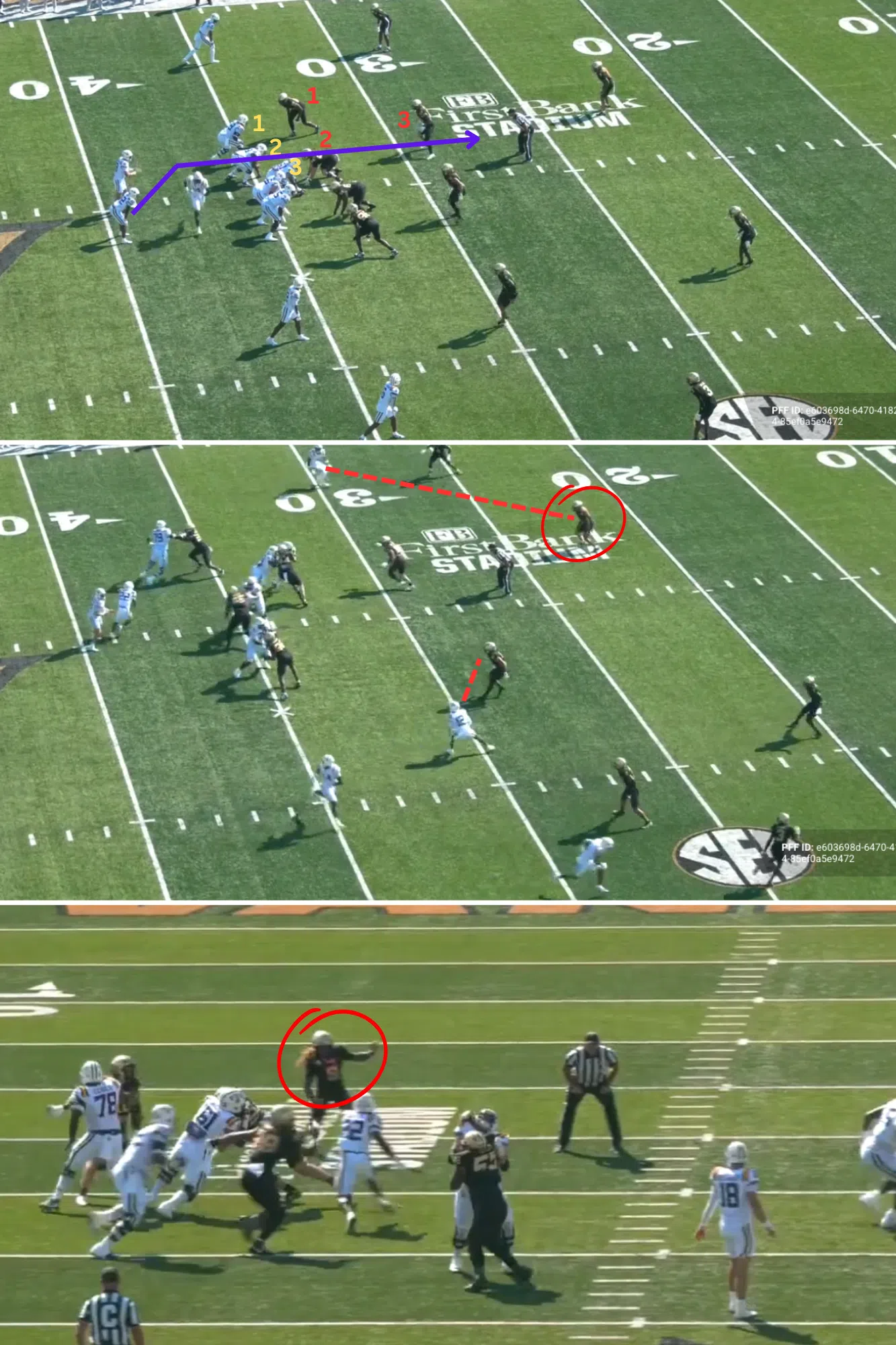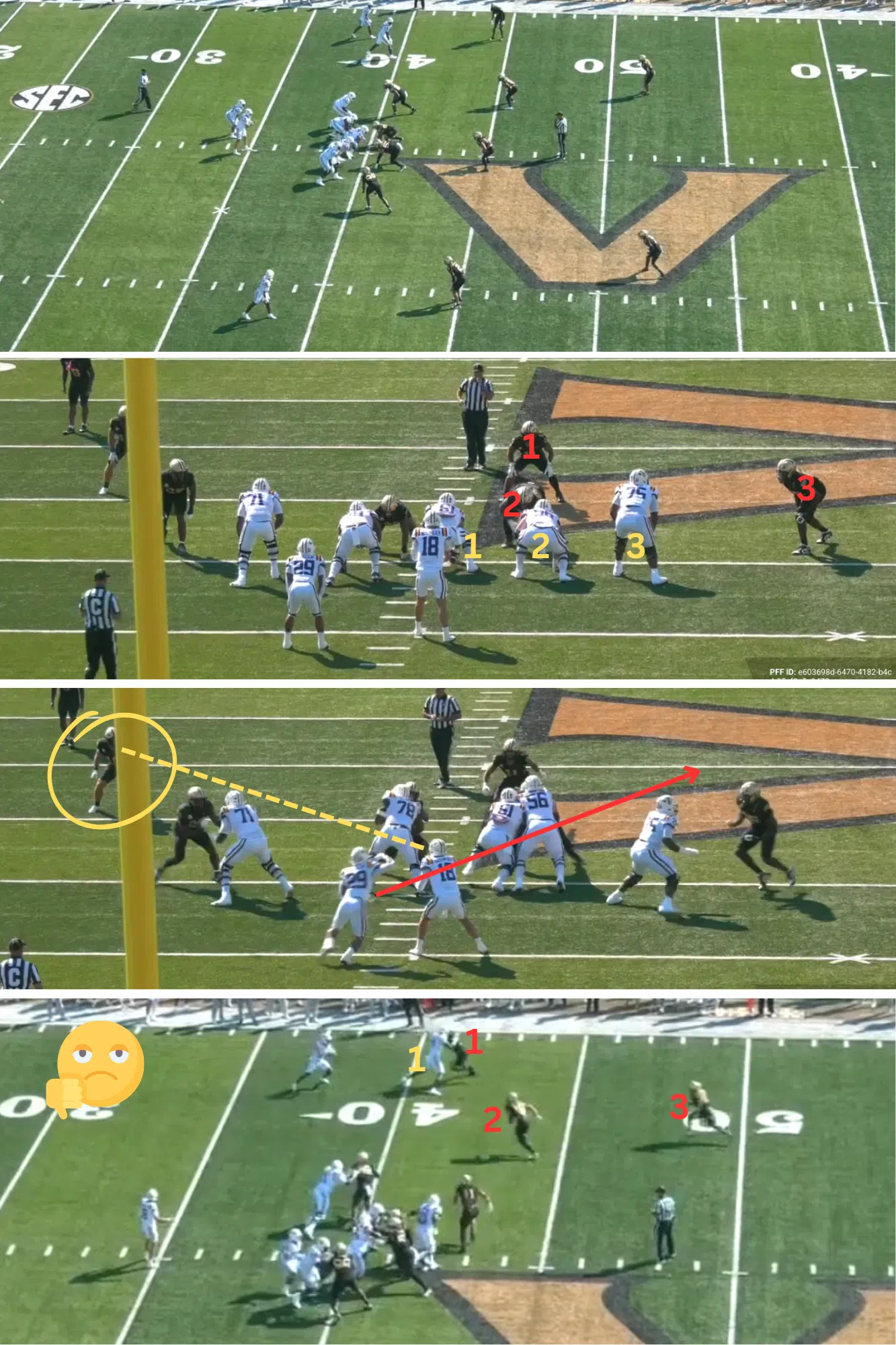 Vandy got burned on this earlier so they decided to play man-to-man and “bracket” the outside two wide receivers. Bracket is just another name for “in and out.” The inside-most defender will take the first receiver that goes inside, and the outside defender will take the receiver who goes outside.