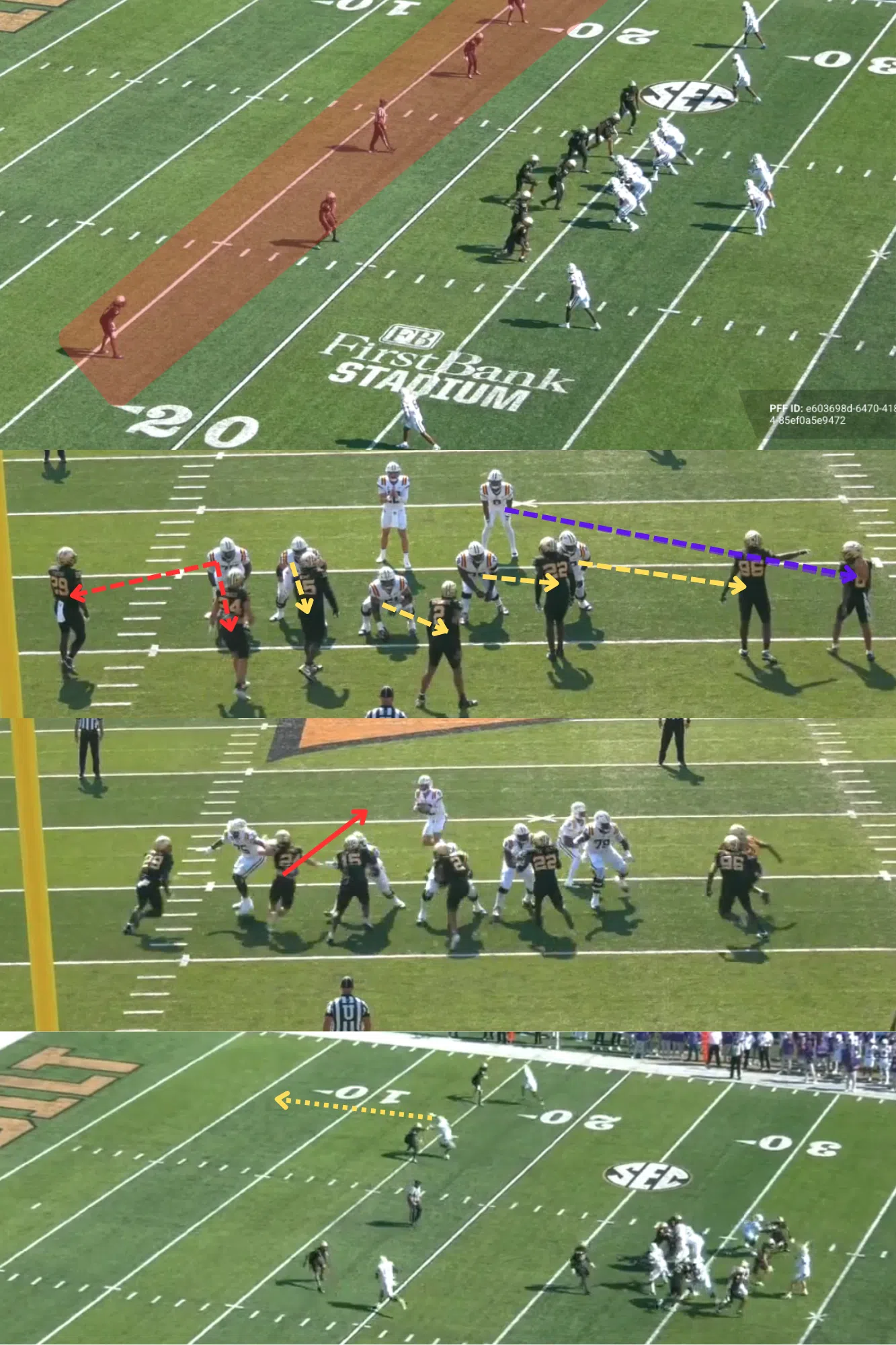 Vanderbilt comes out and shows a cover zero look. Cover zero means that there are zero safeties to help deep. This is straight man-to-man coverage, which you can typically identify when all defensive backs are lined up 8–10 yards off the receivers and positioned on the same level. It also means that they are going to be bringing the house.