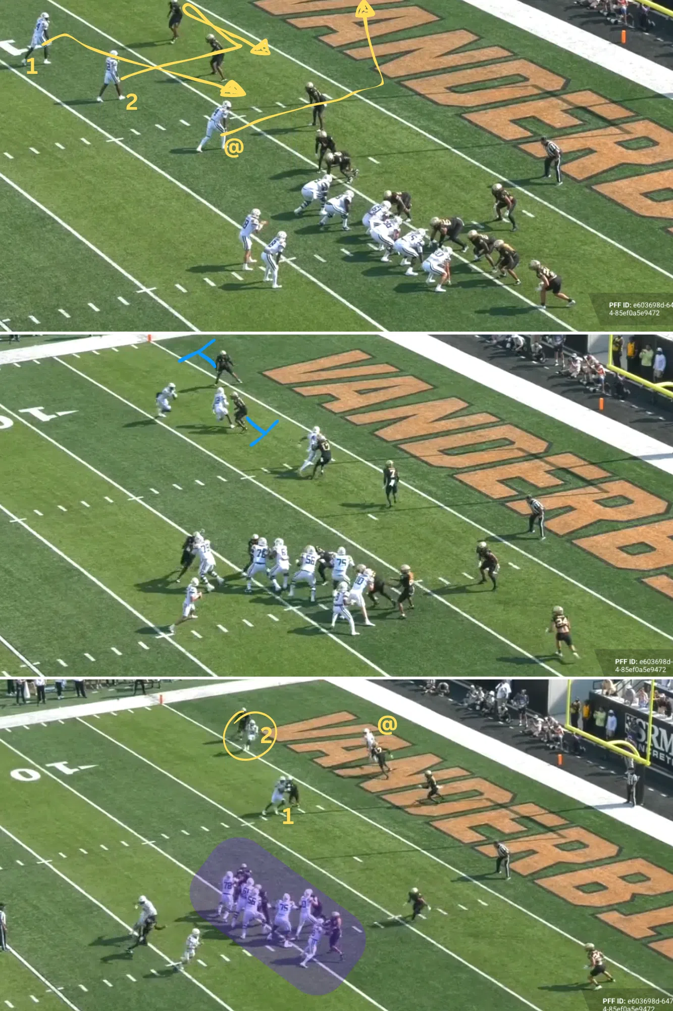 Here’s the full progression on this play: the No. 3 receiver runs a corner route — that’s an alert (“@”) read, meaning the quarterback can go to him first if he likes the pre-snap look. Corner routes are a strong alert option against man coverage. The first true read is the outside receiver on the arrow route, followed by the No. 2 receiver running the “Otter” (out + return) route.