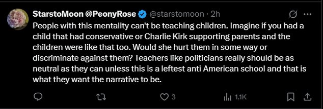One user commented on Fournier’s post and said: ‘People with this mentality can’t be teaching children. Imagine if you had a child that had conservative or Charlie Kirk supporting parents and the children were like that too.’