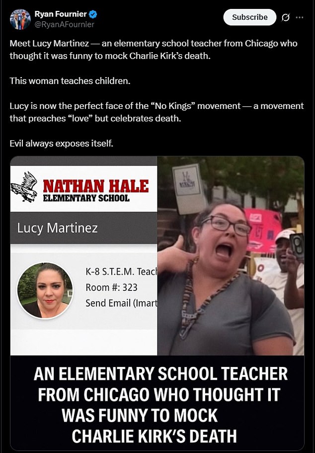 ‘Meet Lucy Martinez – an elementary school teacher from Chicago who thought it was funny to mock Charlie Kirk’s death,’ right-wing commentator and co-founder of Students for Trump, Ryan Fournier, wrote on X.