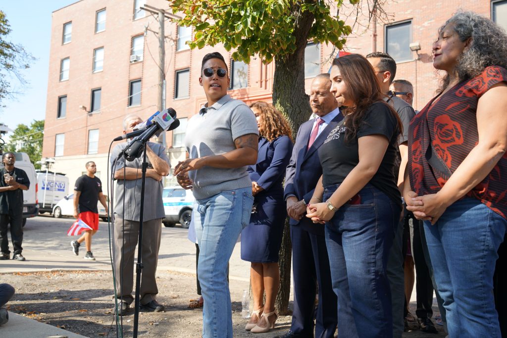 Ald. Jessie Fuentes (26th) speaks during an emergency press conference outside Humboldt Park Health on Oct. 3, 2025 denouncing ICE after she was briefly handcuffed by agents inside the hospital for asking if they had a warrant for the man they were detaining. Credit: Ariel Parrella-Aureli/Block Club Chicago