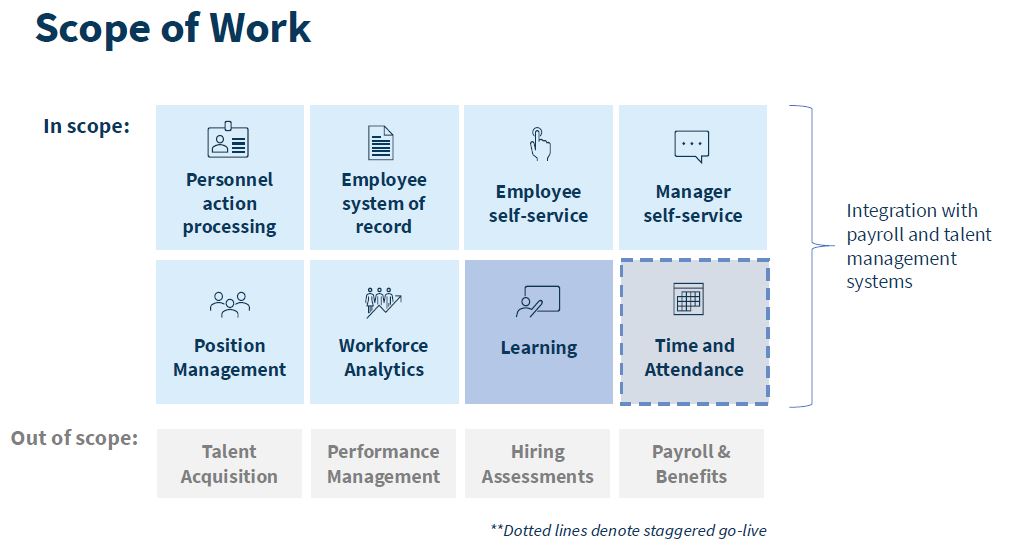 “Agency Transition will begin at completion of the Core Implementation. OPM will staff a Governmentwide Program Management Office (GPMO) that will provide support for the transitions along with the contractor. This GPMO will include contracting officer representatives (CORs), account managers, business analysts, system testers, system trainers, Tier 1 help desk support and data scientists. It will also include additional technical resources from the OPM CIO responsible for governance, architecture, integration, security, identity management, data migration and infrastructure readiness support to ensure alignment with enterprise IT policies and successful implementation of the SaaS Core HCM platform,” OPM stated in the RFP. “The GPMO is responsible for project oversight, compliance with federal security standards, and support for system integration and SSO and will serve as the primary integrator responsible for working directly with the agencies. The contractor resources will support OPM with agency transitions and will take direction from OPM.”