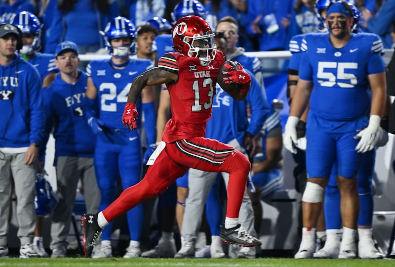 Utah running back Daniel Bray (13) sprints down the sideline for a touchdown as BYU and Utah play at LaVell Edwards Stadium in Provo on Saturday, Oct. 18, 2025. | Scott G Winterton, Deseret News 6. Utah Utes (5-2, 2-2 Big 12)