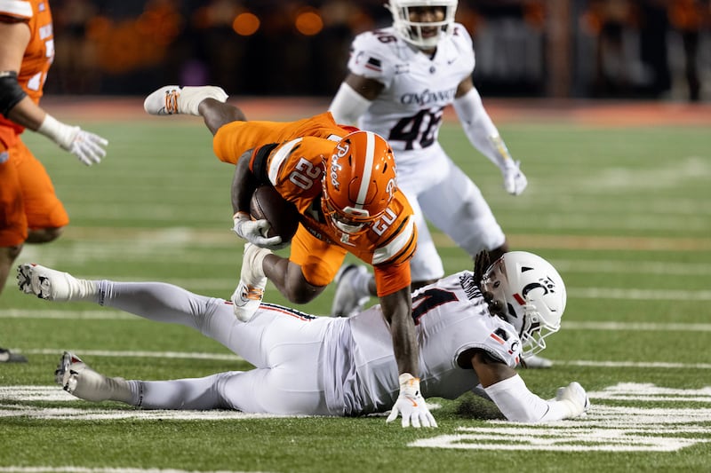 Cincinnati defensive end Mikah Coleman, bottom, tackles Oklahoma State running back Rodney Fields Jr. (20) in a game Saturday, Oct. 18, 2025, in Stillwater, Okla. | Mitch Alcala, Associated Press