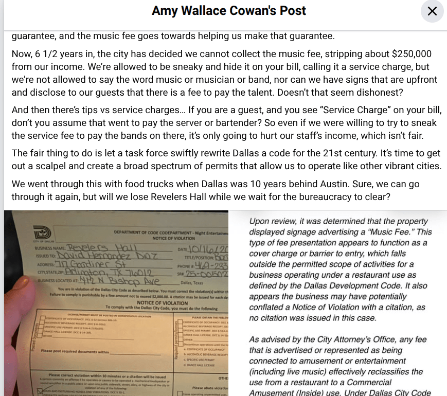 “The city of Dallas’ Nightime Task Force suddenly came in over the past few weeks and have been extremely heavy handed out of nowhere. We presumed they existed to help grow and support nightime [sic] business, but immediately told us to remove our Music Fee…which is how we pay the bands and have done so for over half a decade,” he wrote.