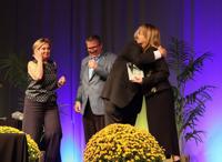 From left: Doreen Bruner and Doug Hafer stand on stage as Joe Bruner and Maggie Campbell hug at the Downtown Arlington Annual Meeting on Oct. 22 at the Bluebonnet Ballroom in the University Center. Joe and Doreen Bruner were recipients of the Dream Builder award, presented by Texas Trust.