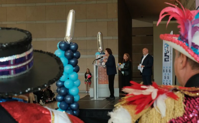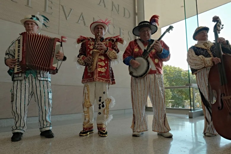A group of mummers watch Jane Golden, Executive Director of Mural Arts Philadelphia, explain the organization’s role in creating the “#1 Sculptures” that will be displayed around the city. (Ben Benett/Billy Penn)